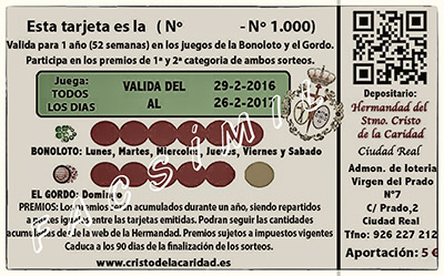La Hermandad ha puesto a la venta una tarjeta con la que se podrá jugar durante todo un año a la Bonoloto y al Gordo de la Primitiva. Si quieres participar y a la vez ayudar a la Hermandad, ponte en contacto con cualquier miembro de la Junta Gestora y adquiere una tarjeta. También podrás adquirir la tarjeta el día de la Asamblea general de hermanos (día 30 de enero). El precio de la tarjeta es de 5 euros.